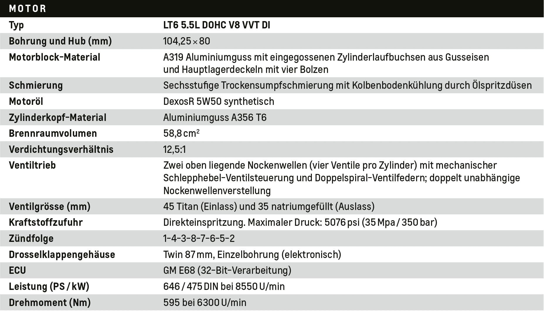 Mit einem Zylinderabstand von 111,76 Millimetern und einer Bohrung von 104,25 Millimetern knüpft der Motor an die Tradition der Chevrolet Small-Block-Bauweise an. Eine intelligent geregelte Ölversorgung mit variabler Fördermenge und mehreren Pumpenstufen stellt sicher, dass der Motor auch unter hoher Belastung zuverlässig geschmiert wird. So bleibt die volle Leistungsfähigkeit selbst bei intensiver Fahrweise auf der Rennstrecke erhalten.