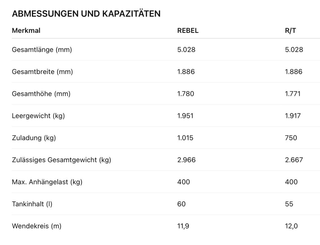 Das Bild zeigt eine tabellarische Übersicht der Abmessungen und Kapazitäten der beiden Modellvarianten des RAM Rampage: Rebel und R/T. In der Tabelle werden jeweils die Werte für zentrale technische Merkmale beider Ausführungen gegenübergestellt.