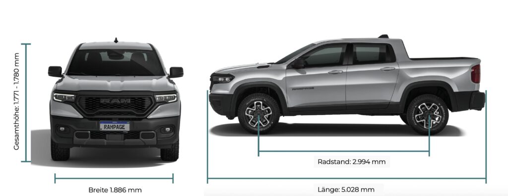 Das Bild zeigt die Abmessungen des neuen RAM Rampage in einer anschaulichen Darstellung mit zwei Fahrzeugansichten – Frontal- und Seitenansicht – inklusive beschrifteter Maßangaben.